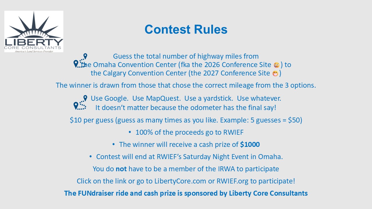 This year’s ride was from Omaha, NE to Calgary, AB, which is the site of the 2027 IRWA conference. For a chance at the $1000 prize, go to www.libertycore.com and click on the motorcycle or go to www.rwief.org and click on Events. If you attend the Omaha conference, you can make your guess(s) at the RWIEF booth at the tradeshow. You do not, however, need to attend the conference to participate. The names of those who choose the correct milage will be put in a hat and the winner will be drawn at RWIEF’s Saturday Night Event at the Omaha conference.